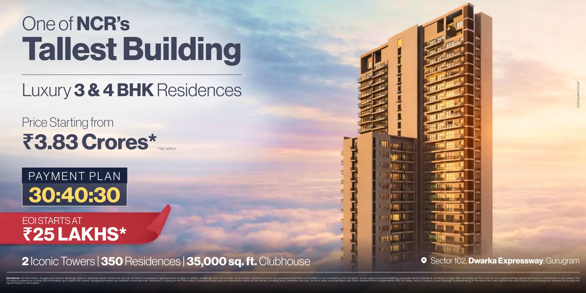 Rising to 158.88 metres, Adani Sector 102 is among the tallest residential developments in NCR. Planned across 5 acres, the project is defined by height, openness, and low-density living.